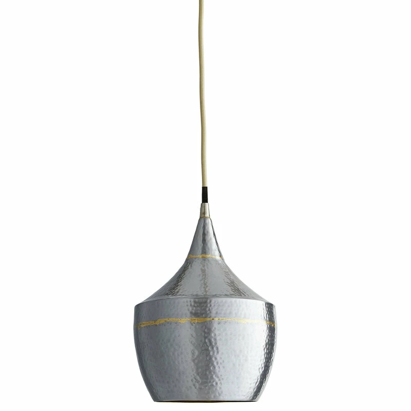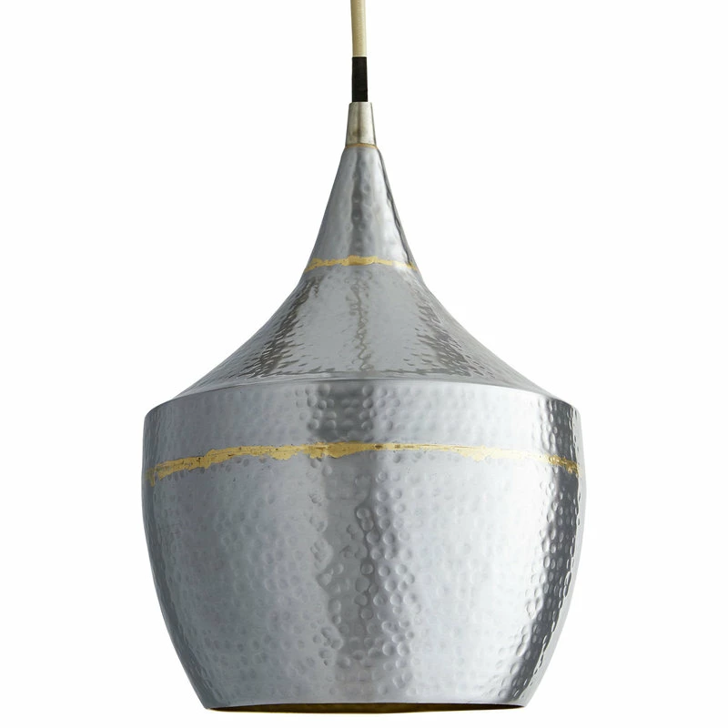 Mixed metal hammered iron pendent with dark silver exterior and interior accented with a brass welds. Silver mesh cord.