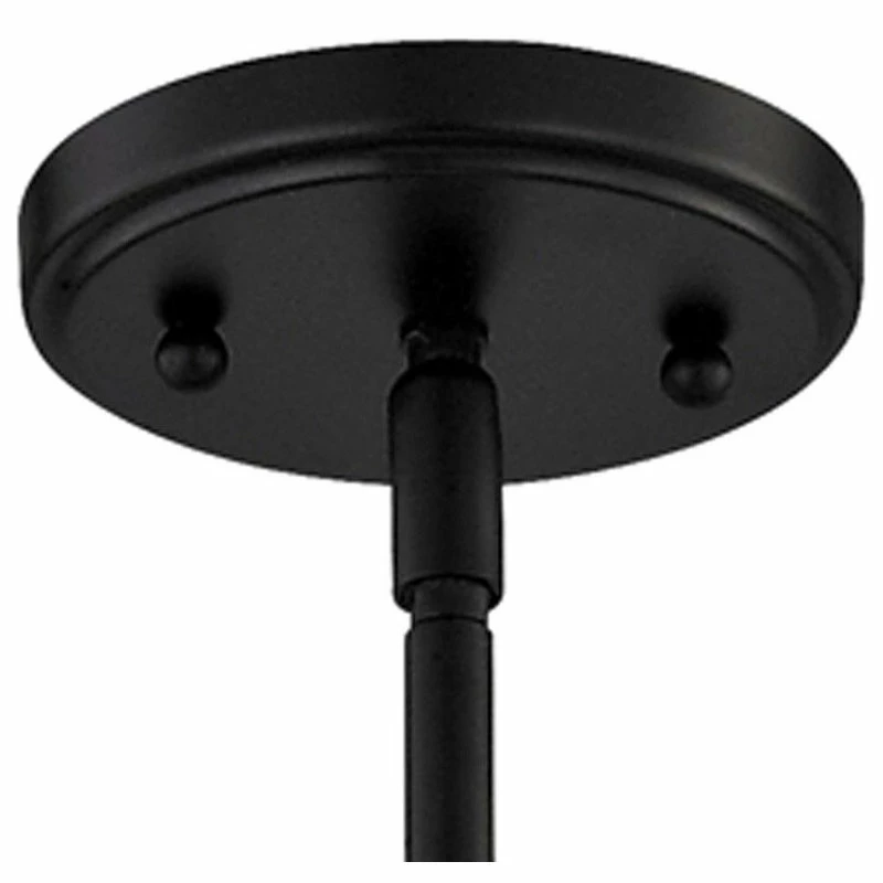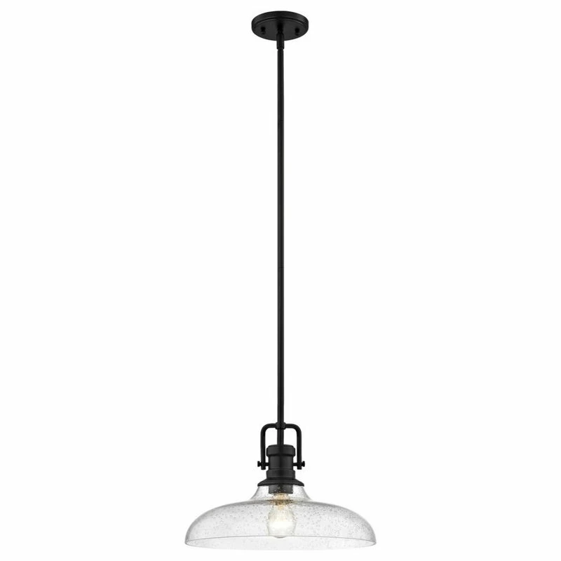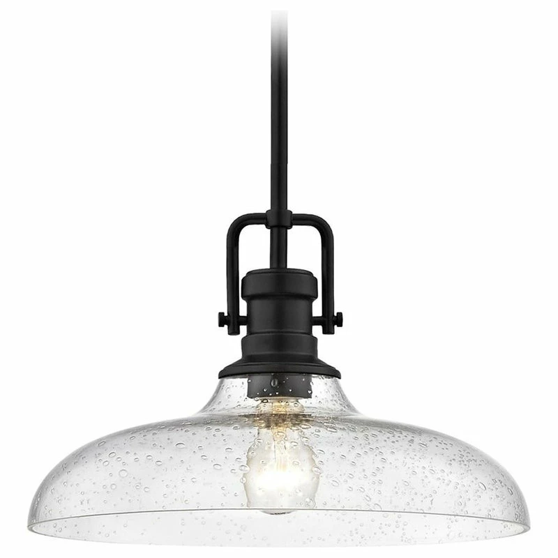 Industrial style matte black 1-light pendant light with seeded clear glass shade. Comes with one 6-inch and three 12-inch downrods which allows you to mount the height between 17.38 and 53.38 inches.