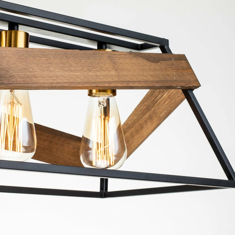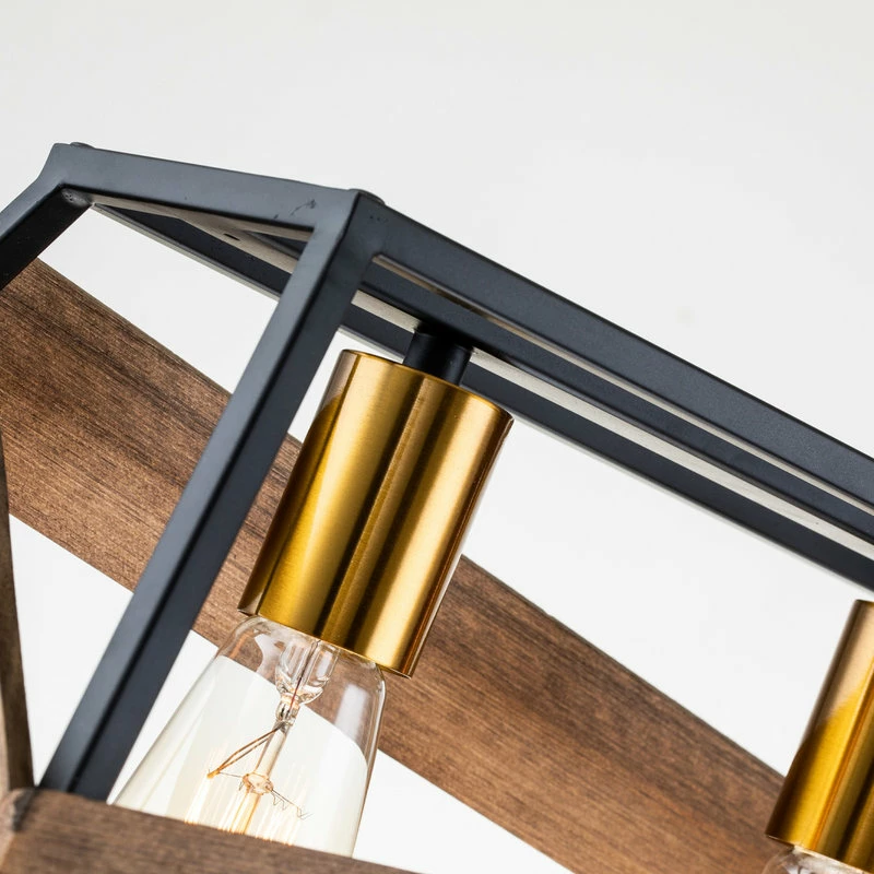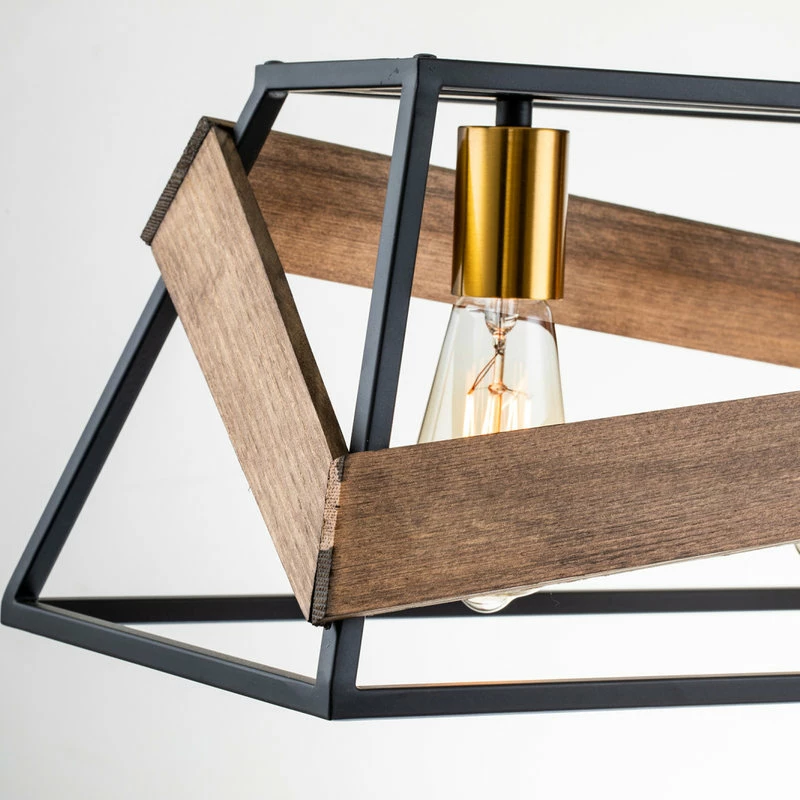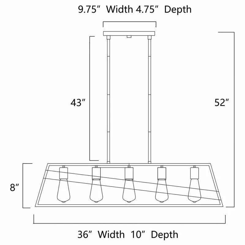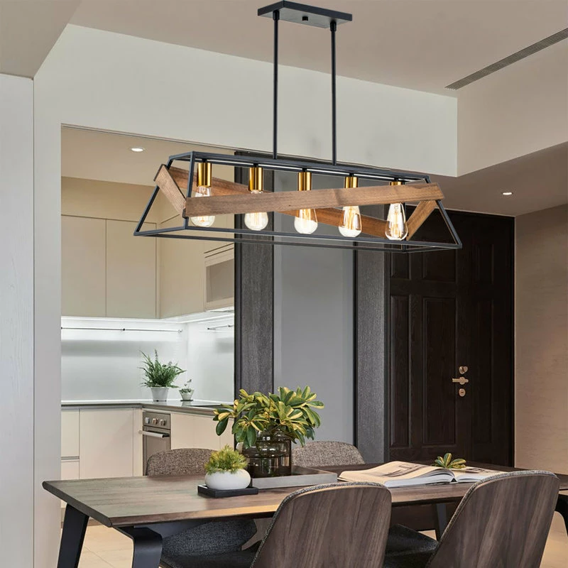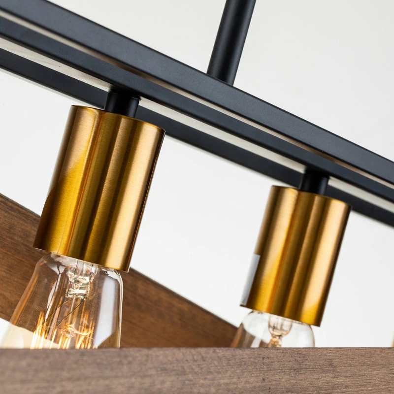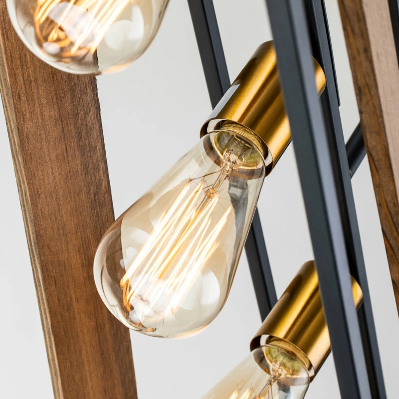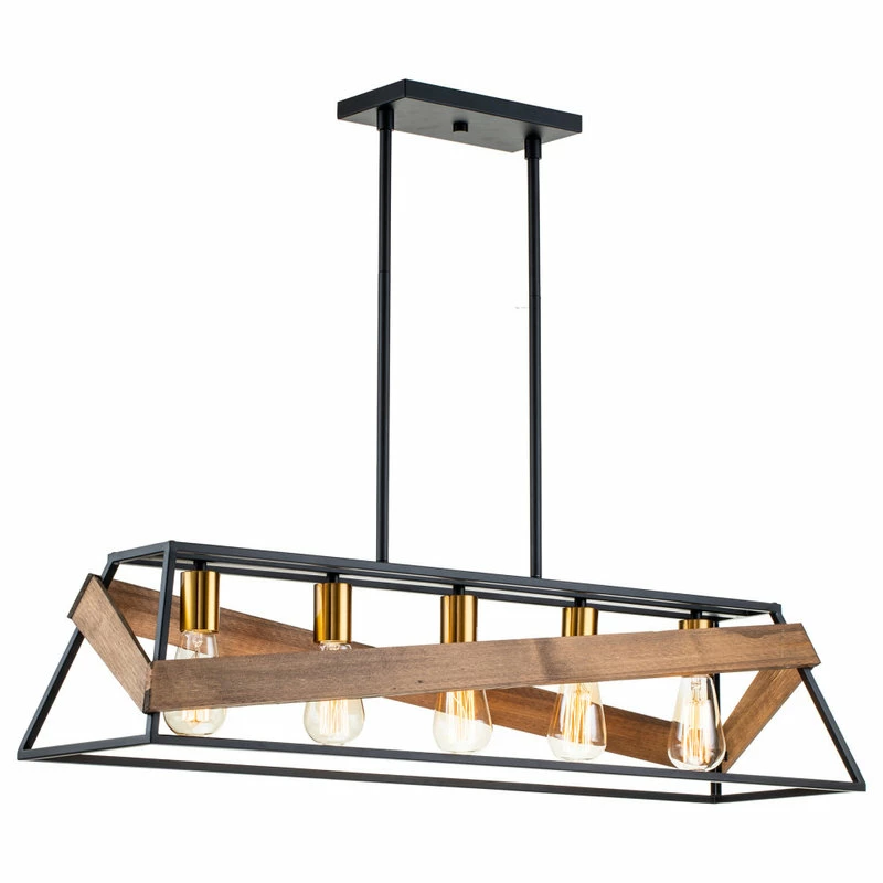 With an exposed bulb design, our five-light chandelier is the perfect statement piece above your kitchen island or dining table. The wood panels add visual interest while the black open work frame works with any interior. The gold bulb bases add boldness to complement the brilliant design of the fixture. Use the included rods in any combination to create a custom hanging position.
