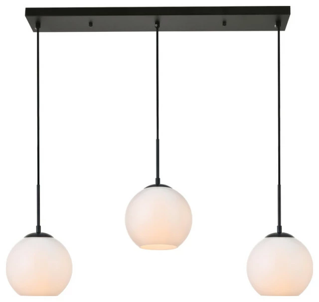 Refined style with a practical design Baxter hanging pendant lamps bring cosmopolitan sophistication anywhere especially to an entryway office bathroom bedroom or kitchen. The smooth iron frame features a rectangular canopy and comes in a black finish. Adjustable black cords allow you to vary the hanging height from 14 to 87 inches. A row of three identical frosted White spherical glass shades remain open at the center to allow for effortless replacement of the filament-style bulbs (not included). Living in the big city has never been this easy.