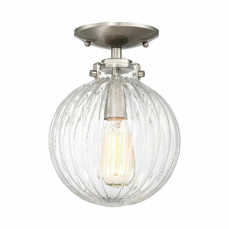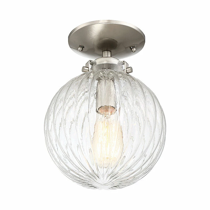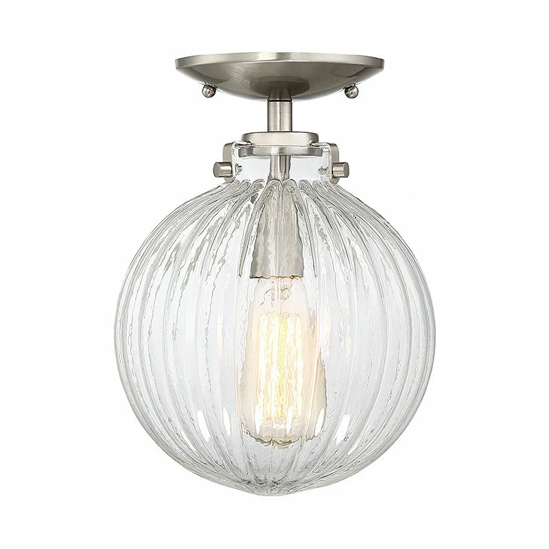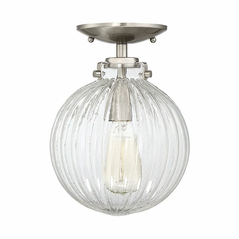 This semi-flush mount showcases an intriguing vintage-inspired look that is perfect for today’s homes. Its orb-shaped ribbed clear glass shade brings eye-catching texture to go with the brushed nickel finish.