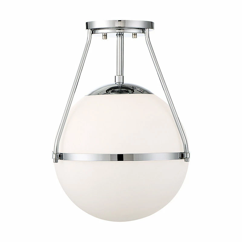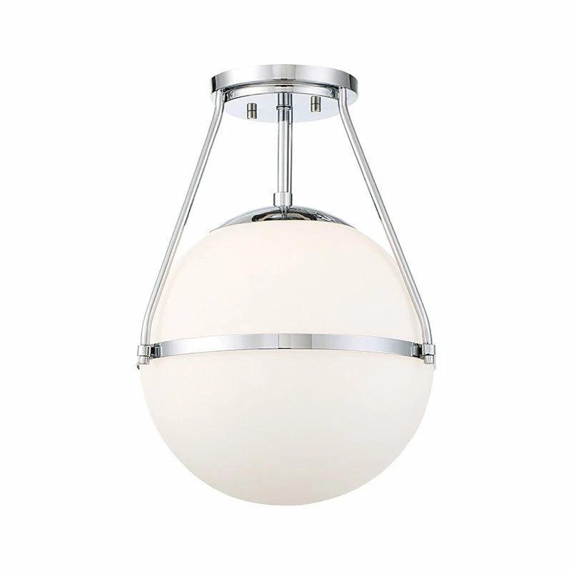 Find a gorgeous, retro-inspired glow with this semi-flush mount light. Its orb shade of white opal glass wears a thin metal band accent that adds another little touch of style.