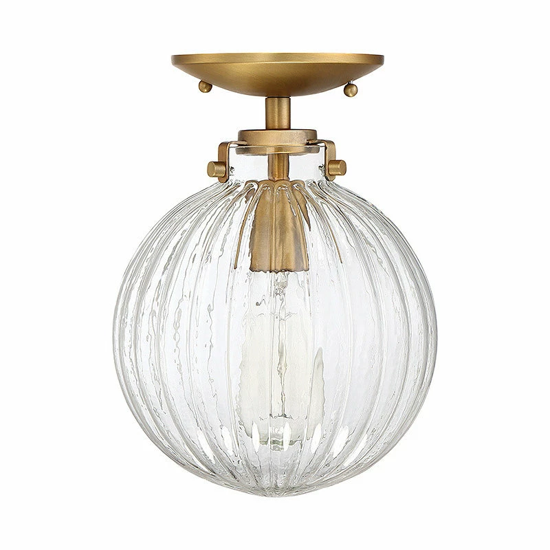 This semi-flush mount showcases an intriguing vintage-inspired look that is perfect for today’s homes. Its orb-shaped ribbed clear glass shade brings eye-catching texture to go with the natural brass finish.