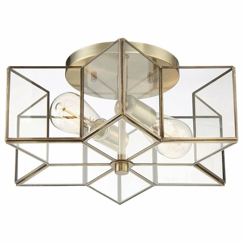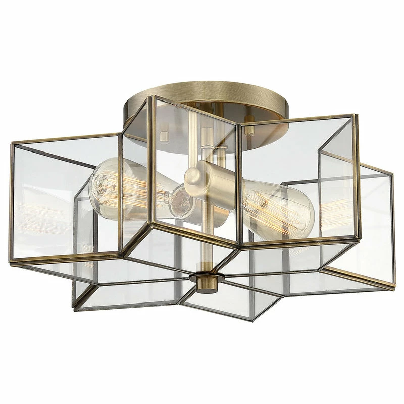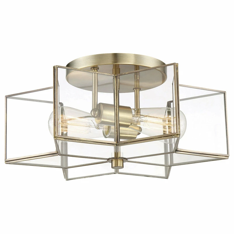 Make your home shine like the stars with this bold two-light semi-flush mount. Its eight-point star design features panes of clear glass and a natural brass finish.