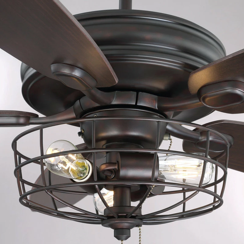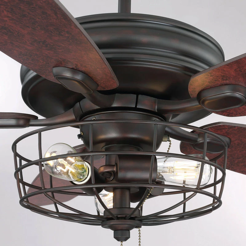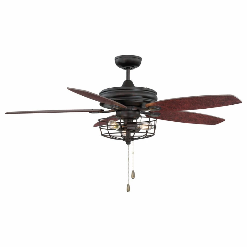 Add industrial style to your home with this ceiling fan, which offers up a metal wire cage to protect the exposed light sources and is finished in oil rubbed bronze. Reversible blades allow you to choose from cherry and chestnut.