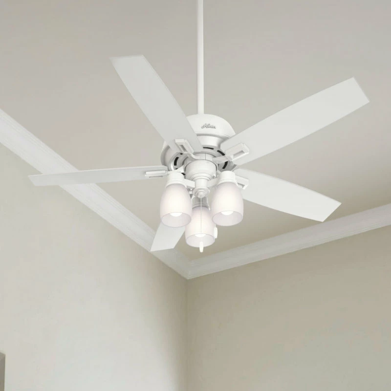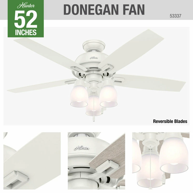 The Donegan boasts a sophisticated design with casual appeal. As part of the Hunter Designer Series, this fan showcases high-end finishes and rustic features making it a perfect accent in any room with farmhouse home decor style. The powerful motor and 52-inch blades will keep the air moving in your bedroom and living room, and the high-efficiency, dimmable LED bulbs in the three-light fixture are fully adjustable for the perfect amount of light. The Donegan collection has a large variety of finishes, sizes, lighting options and more so you can carry a consistent design theme throughout every room in your home.