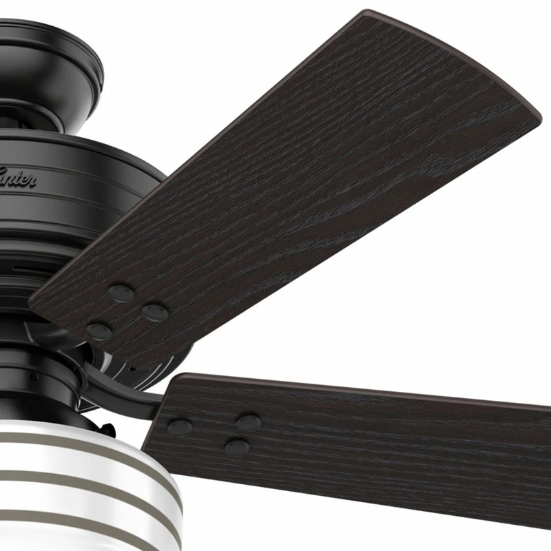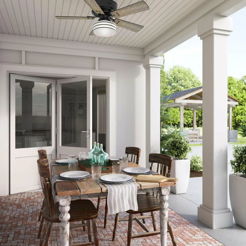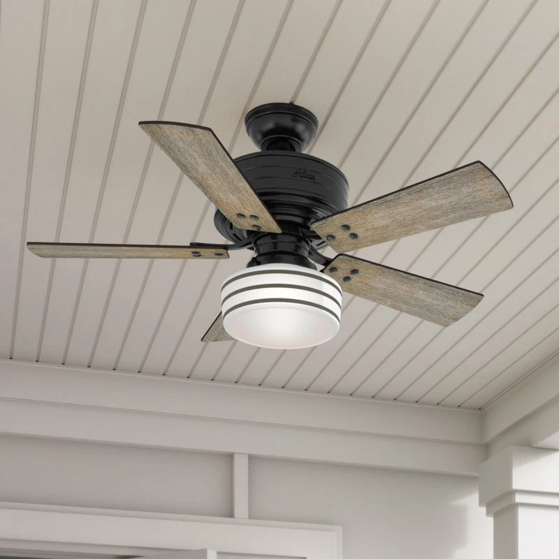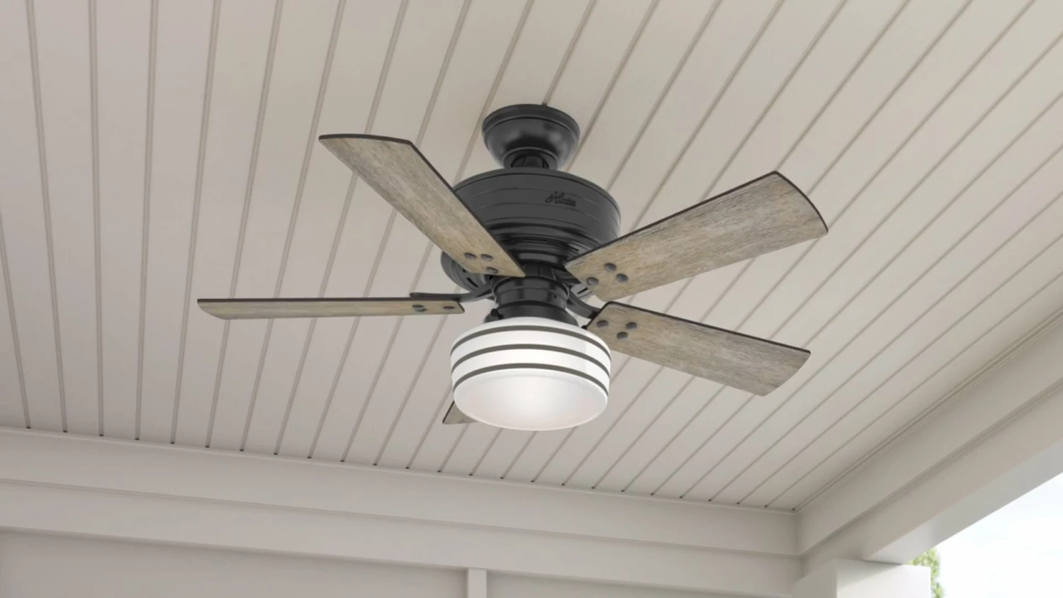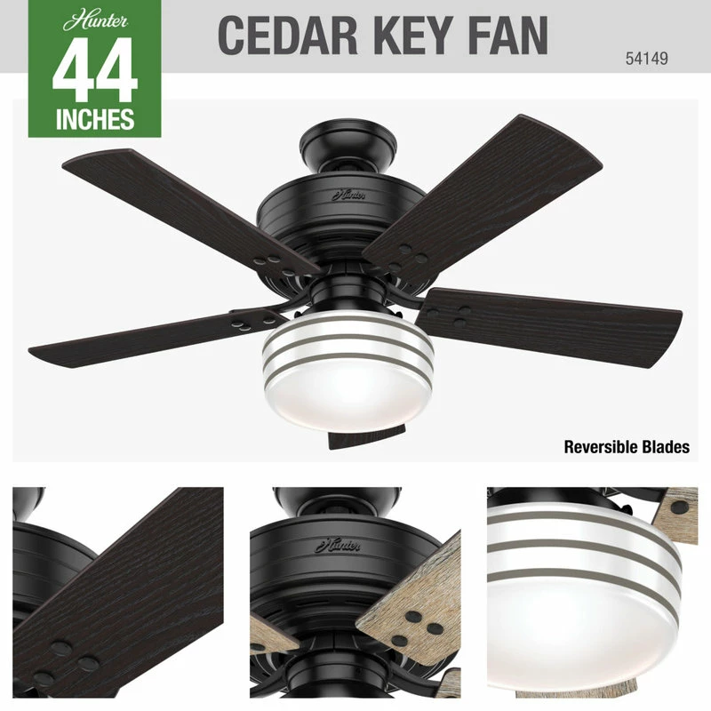 The Cedar Key rustic ceiling fan is inspired by farmhouse design elements, from the lines in the housing reminiscent of shiplap to the rustic finishes on the reversible blades. The star of this ceiling fan is the unique handpainted globe, a true nod to the expert craftsmanship at Hunter Fan Company. Go for a coastal look with the White finish and navy striped glass or complement your farmhouse decor with the Matte Black finish and grey glass. The Cedar Key fan has a powerful three-speed motor for exceptional airflow and whisper-quiet performance. Great for covered porches and patios, this damp-rated outdoor ceiling fan has a pre-installed remote control receiver and snap-and-lock light fixture for easy installation. With various sizes and finishes in the Cedar Key collection, you can maintain a consistent style throughout your home while customizing the look of each room.
