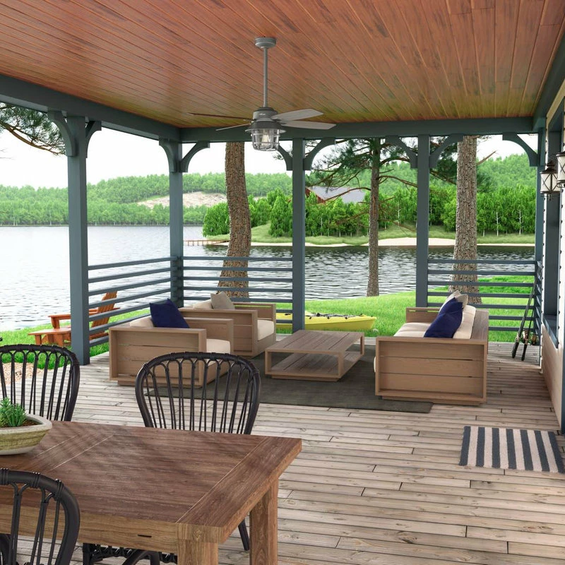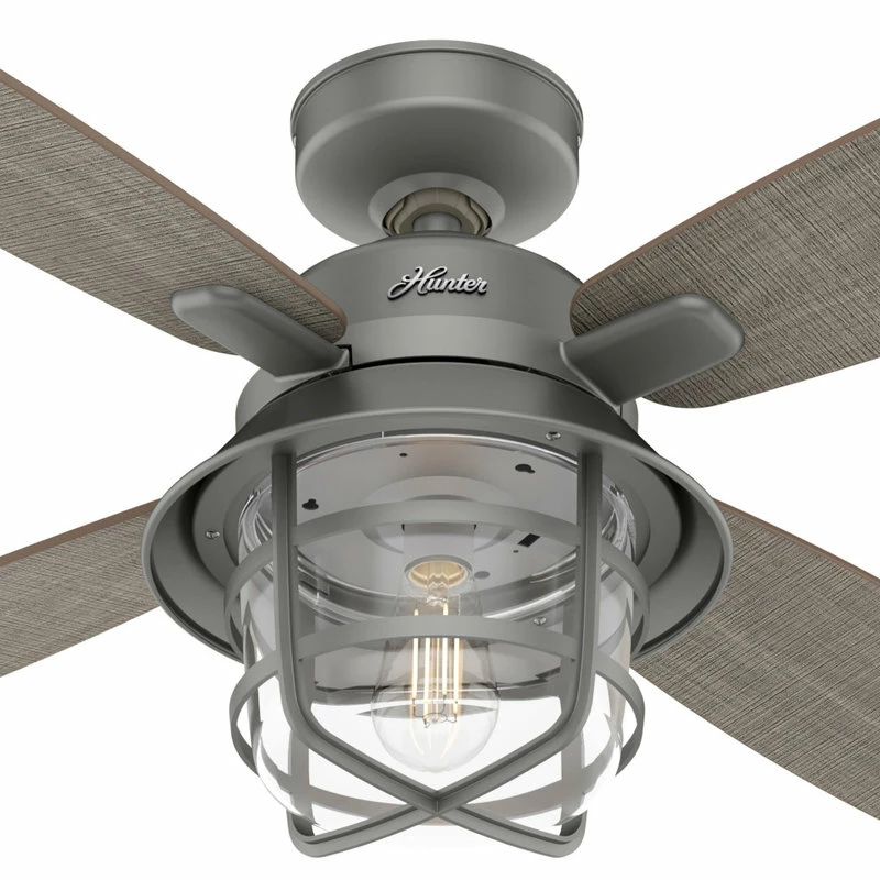 Rustic finishes and vintage details bring the Port Royale outdoor ceiling fan to life. The roasted maple blade finishes complement the lantern-inspired light fixture and energy-efficient LED Edison bulb. This farmhouse-inspired ceiling fan includes a handheld remote for easy changes to fan speed and light dimming. The damp rated Port Royale ceiling fan is perfect for covered porches and patios as well as indoor living rooms and bedrooms.