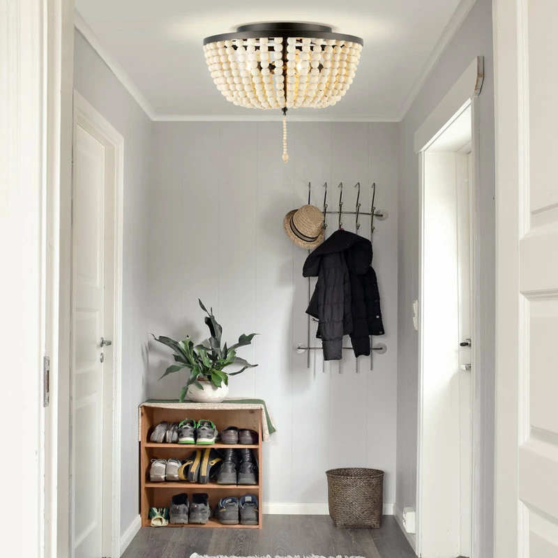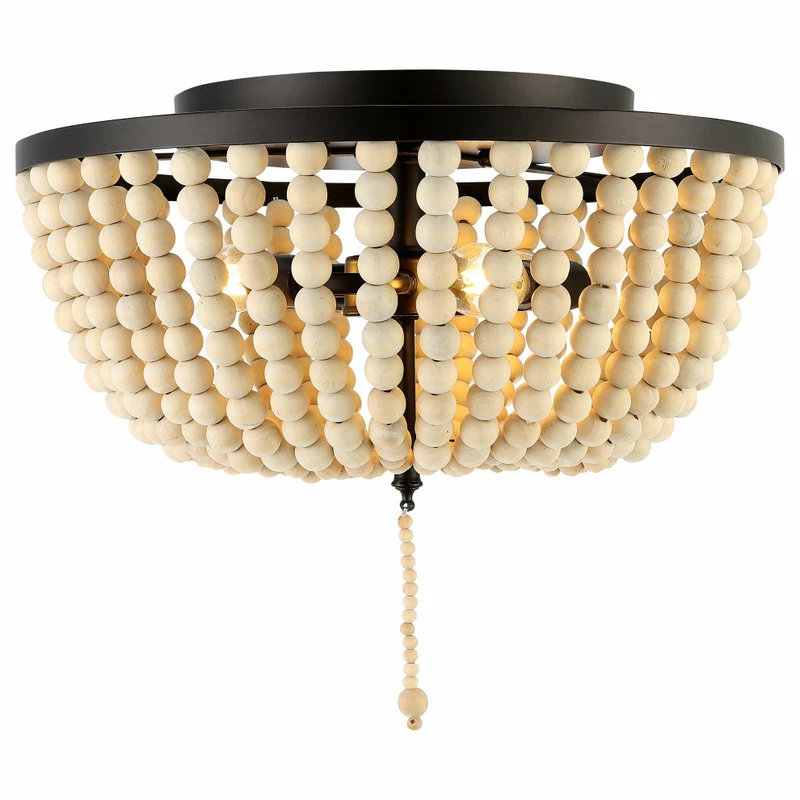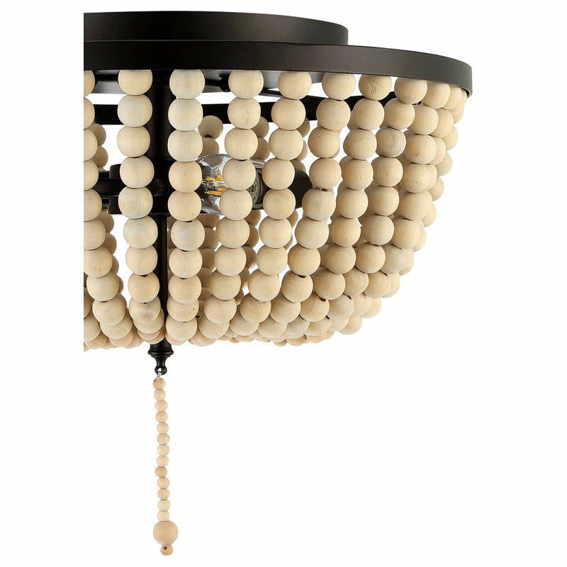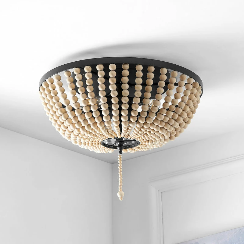 - A flush mount with serious style: neutral-toned wood beads and a glam black finish accentuate this beaded fixture