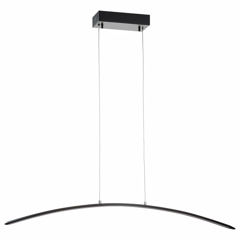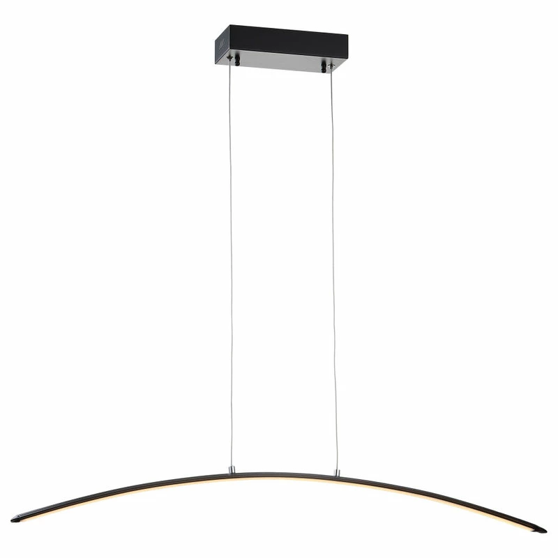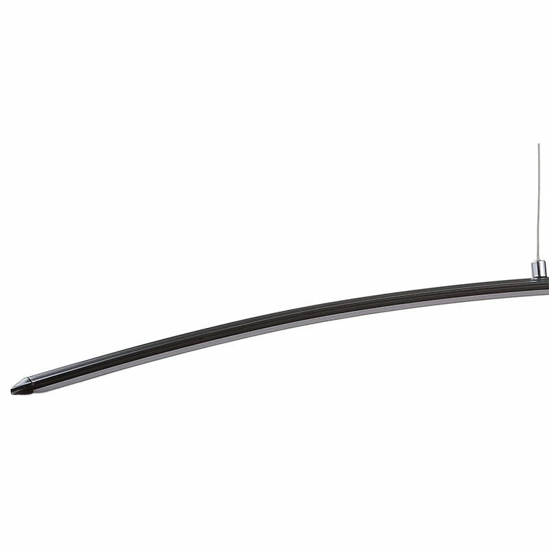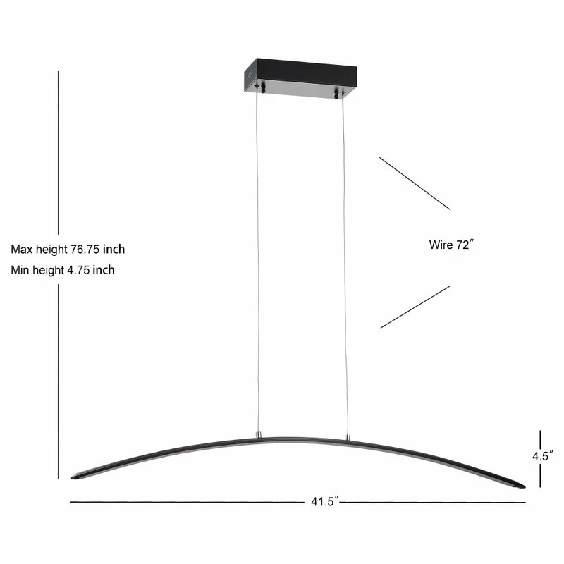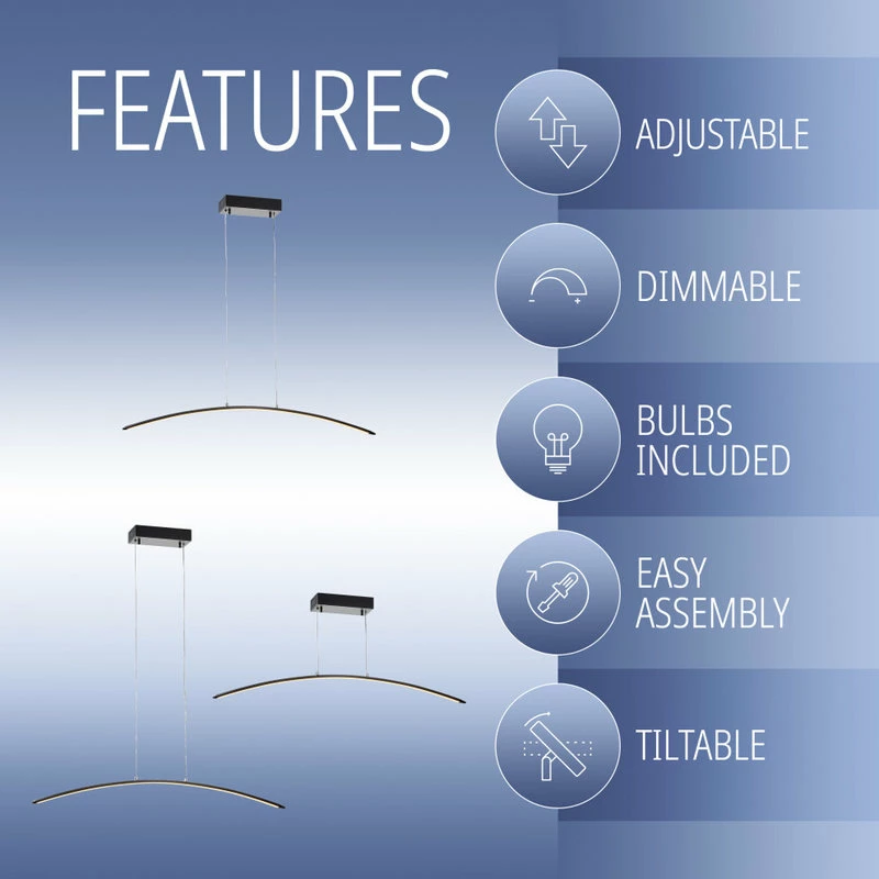 A single, curved line is suspended by clean lines in this sleek pendant. An easy addition to a contemporary space, this piece features an adjustable drop and an integrated LED light. Perfectly suited to hang over a kitchen island or dining area.