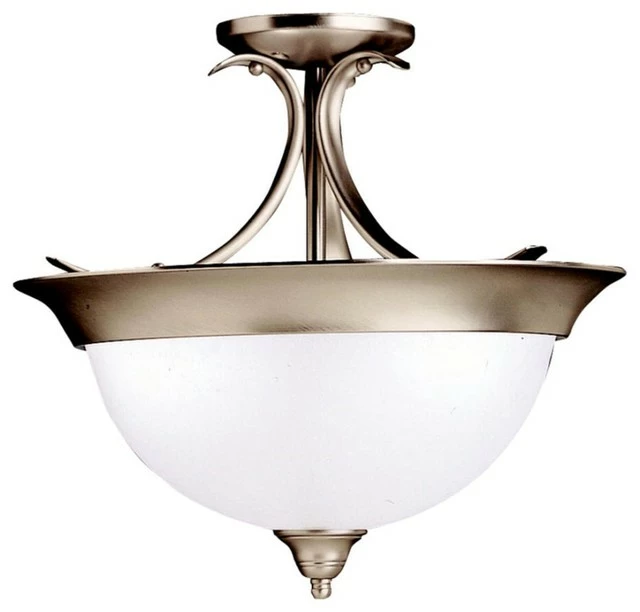 The dover collection takes classic design and offers its own unique, modern twist. Characterized by its sweeping arms, dover fixtures offer a clean look while remaining fresh and exciting. With our brushed nickel finish over its hand-wrought steel frame, you can be sure of a high quality fit and finish that is second to none. This 3 light dover semi-flush uses 60-watt (max.) Bulbs for everyday lighting. With its etched seedy glass base, this fixture brings a timeless design into any room.