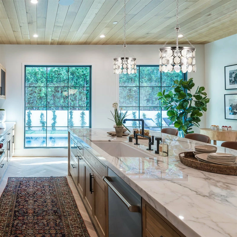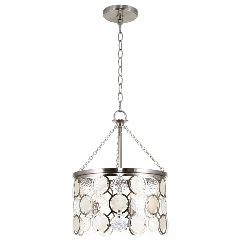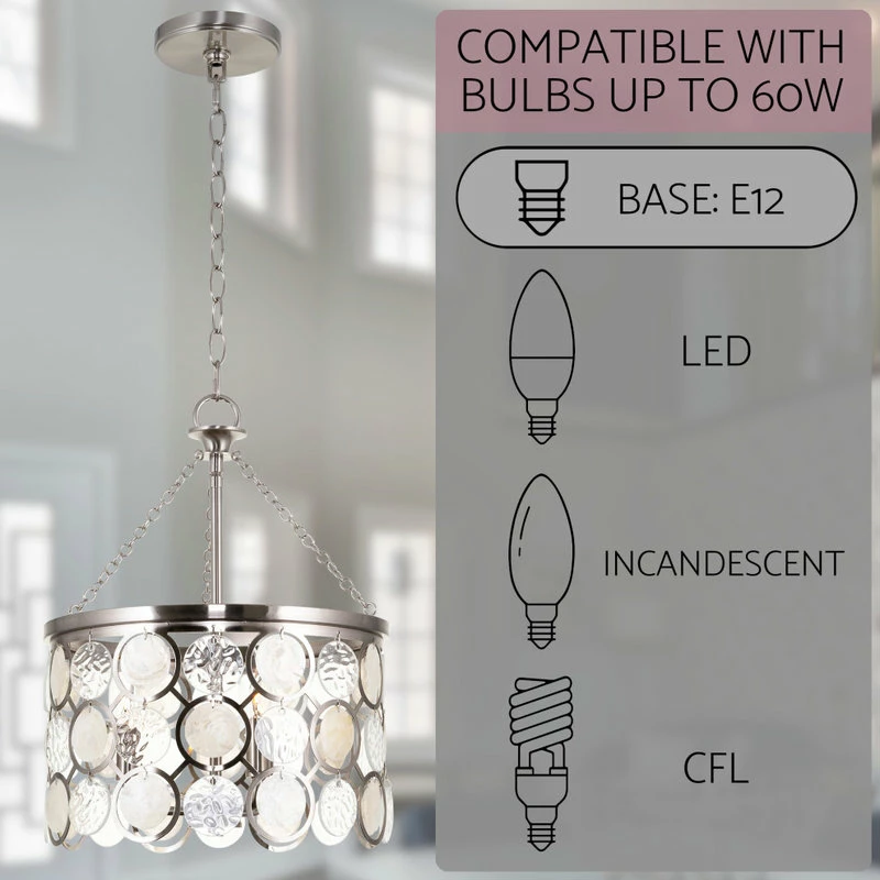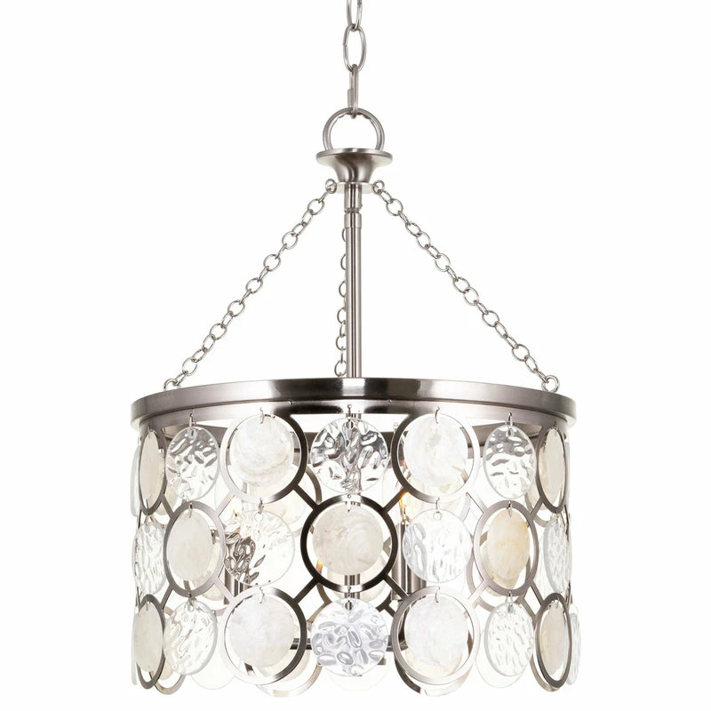 ELEGANT LIGHTING: Beautiful pendant chandelier features a stunning brushed nickel finish while boasting wavy glass and capiz shell hanging accents. The sparkle and light refraction from this stunning piece produces a beautiful pattern and glow