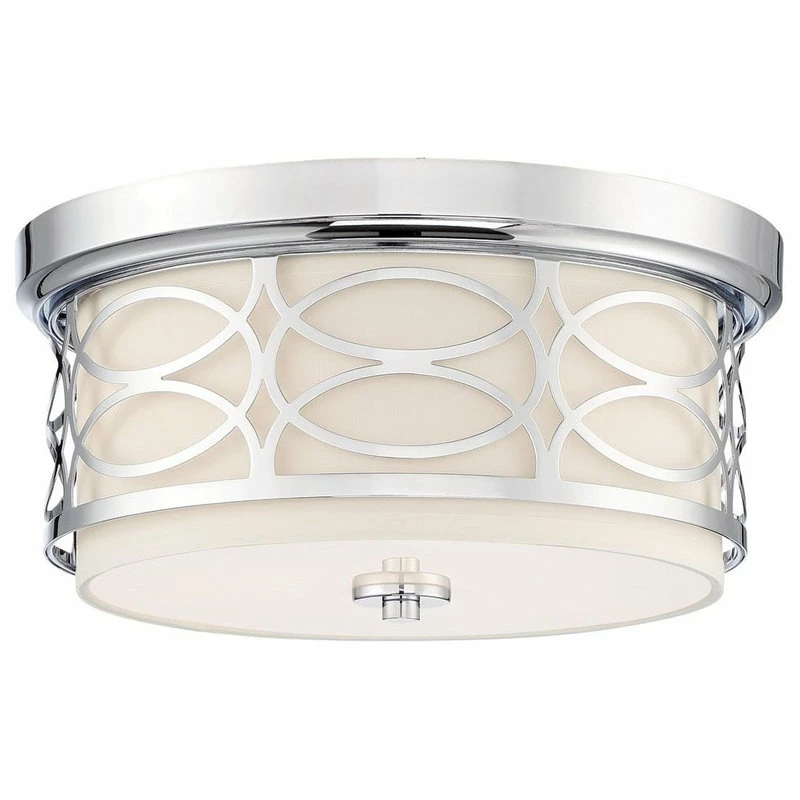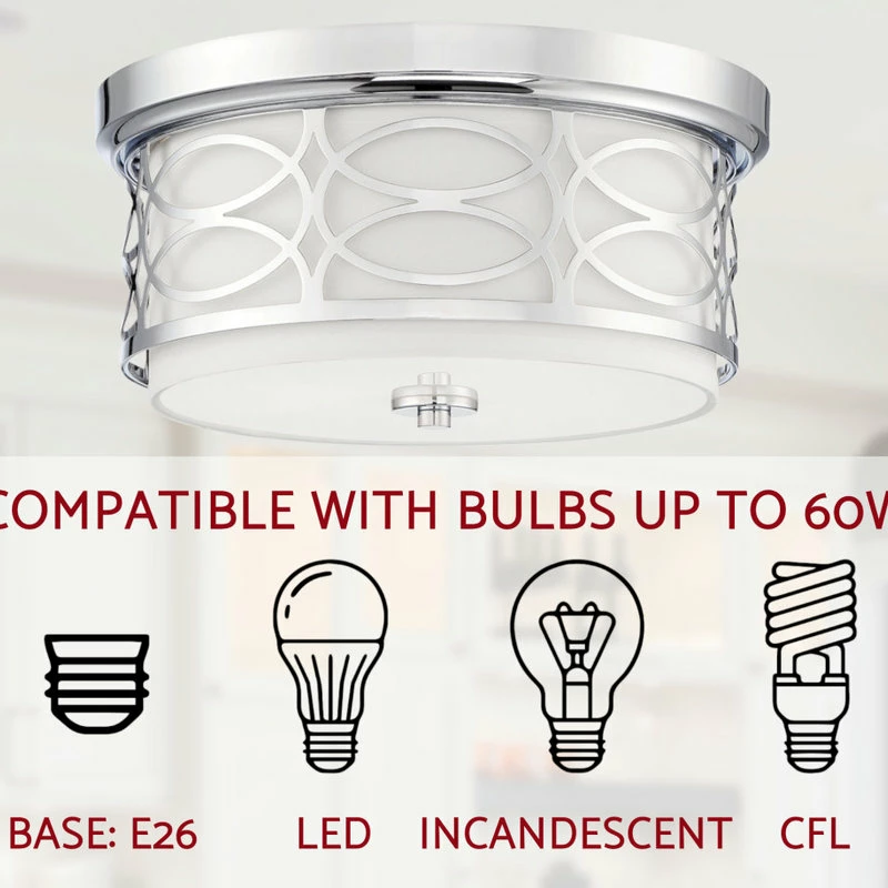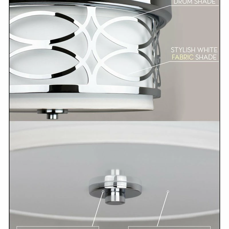 INTRICATE LATTICE DESIGN: Classy close-to-ceiling light features a unique metal drum shade complemented by a stylish white fabric shade and sleek chrome finish. Its tempered glass diffuser casts a soft illumination in any area of your home