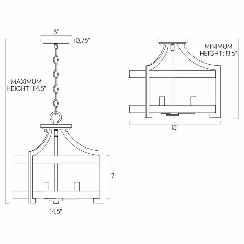 DIMENSIONS: Semi Flush/Pendant Light: 15″ (D) x 13.5″ (H), Canopy: 5″ (D) x 0.75″ (H), Metal Drum Shade: 14.5″ (D) x 7″ (H). Includes 96″ of chain for desired hanging height. Minimum (Semi Flush)/Maximum (Pendant with chain): 13.5″ – 114.5″