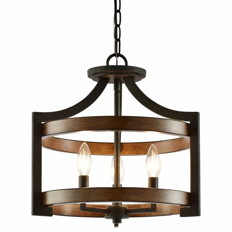 The Woodrow 15″ farmhouse convertible pendant light/semi flush mount adds a uniquely different style to your home. It features a standout walnut style finish paired with a beautiful textured black finish on an open cage design. Brimming with rustic charm and medieval style, Woodrow will brighten up even the darkest of rooms including dining rooms over tables or above a kitchen island or counter. Well constructed and durable, hang in hospitality settings like hotels and restaurants over cafe or bistro tables. Versatile in style, Woodrow will fit a variety of interiors and styles such as modern, Spanish, traditional, country, and more. Adjust the hanging height of this fixture to your preference as 8 feet of chain is included, allowing for minimum/maximum hanging height of 13.5″-114.5″. Mount as a close to ceiling light as a semi flush mount or as a pendant light. When used as a pendant light, Woodrow is also sloped/slanted ceiling compatible to suit your needs. Unlike many of our competitors, this convertible pendant light is ETL approved for your safety.