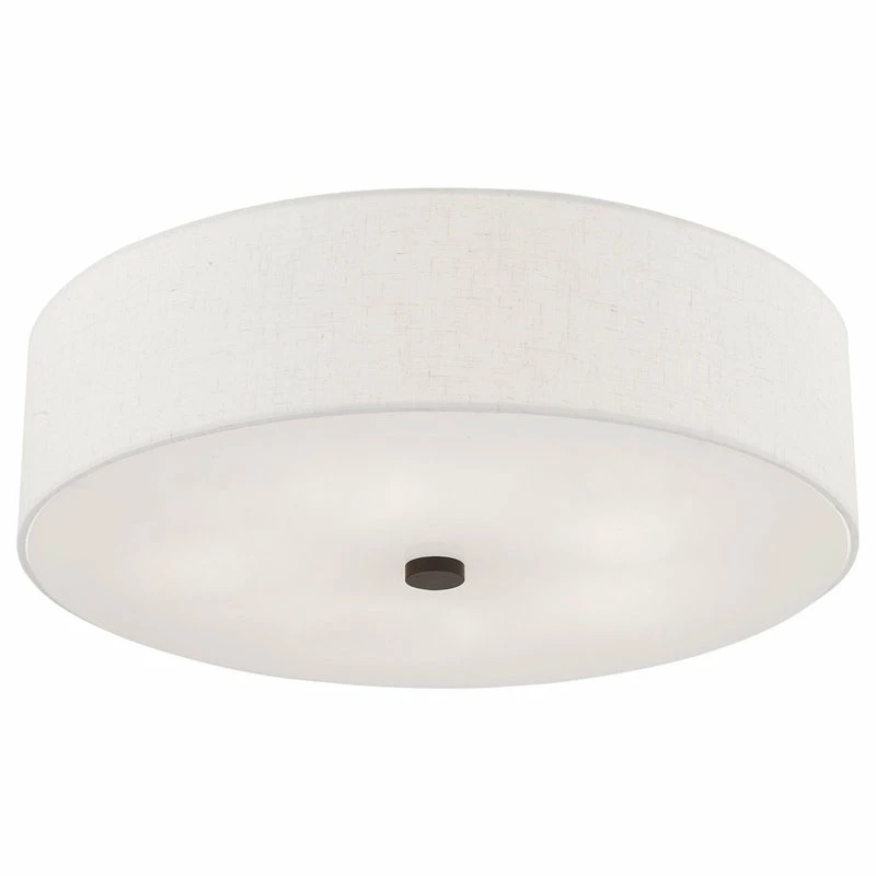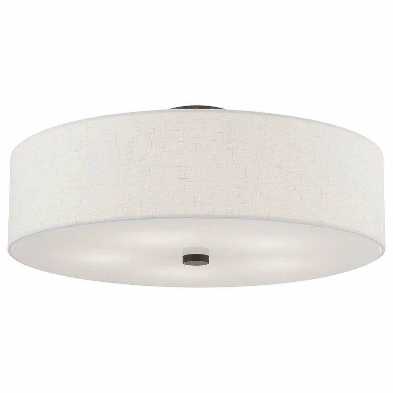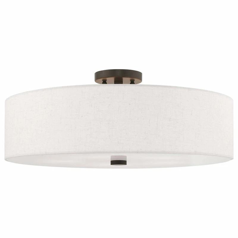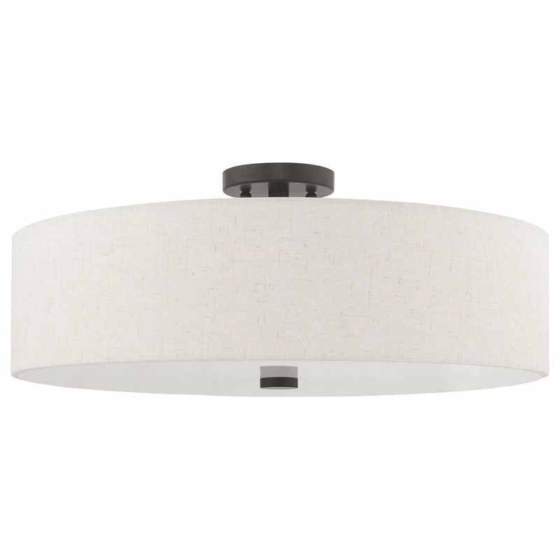 Add style to any room with this elegant semi flush mount. The design features a beautiful hand crafted oatmeal fabric hardback drum shade in a stylish English bronze.