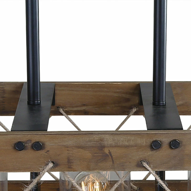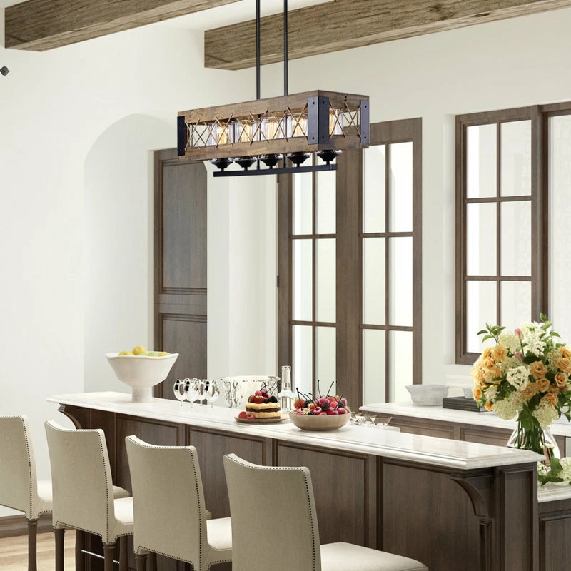 Being functional and versatile, this 5-light wood kitchen island will add a farmhouse rustic appeal to any space. Well crafted of wood and glass inside, this rectangular farmhouse kitchen island is a perfect blend of black finish and brown finish. Inspired by a wood cage- designed open frame, this dining room kitchen island is strengthened by cross-iron for a better look. Besides,two solid hanging poles connect the mainframe to a sloped ceiling compatible canopy.The chandelier’s farmhouse-inspired design is ideal for any dining room, foyer, great room, or kitchen in coastal, craftsman, farmhouse, rustic, urban industrial, and vintage electric interiors. It’s time to breathe new life into the mundane every day with timeless and truly transformative lighting. Make your purchase today to begin your journey to a whole new lighting experience.
