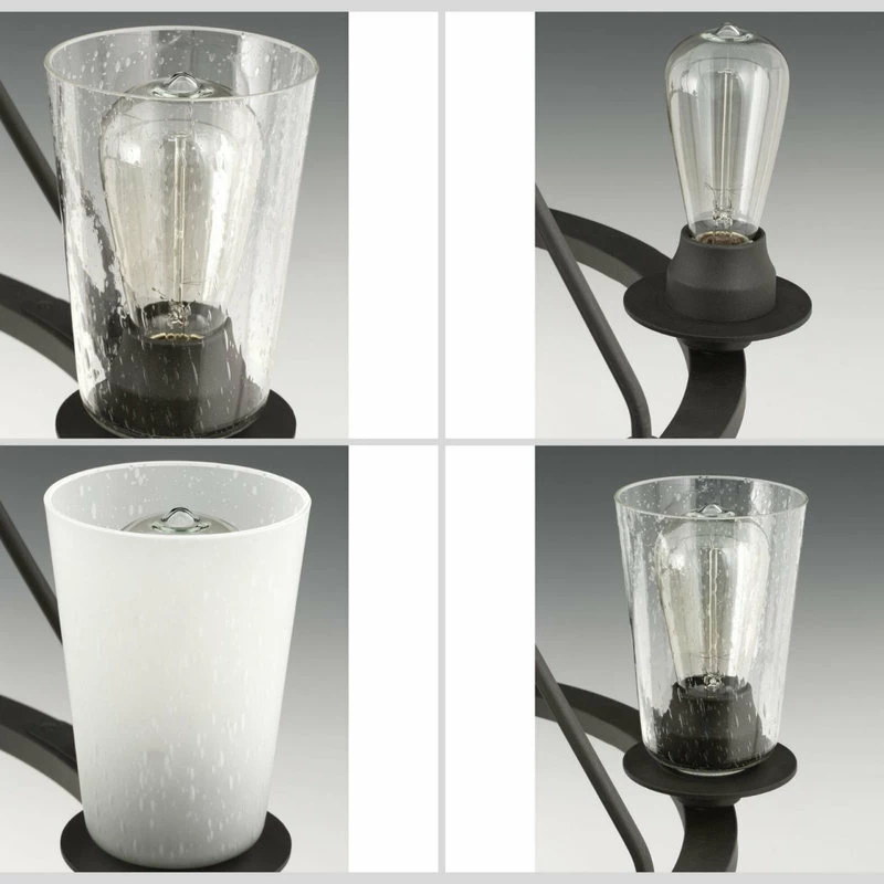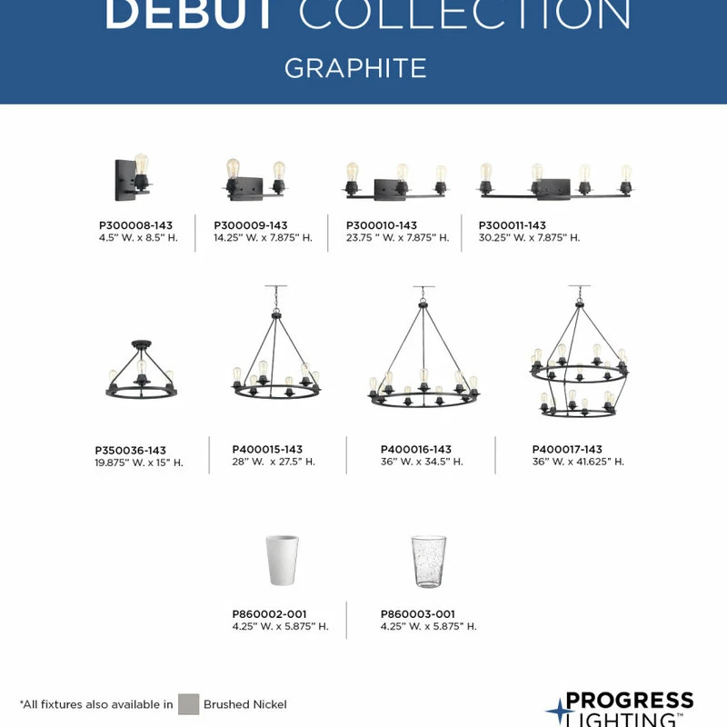 A new category of vintage modern fixtures takes center stage. Delicate details and warm finish options, including Graphite and Brushed Nickel, create statement making focal pieces for a variety of interiors. Debut provides a fitting stage to feature nostalgic, vintage lamps. Glass accessory shades in clear or frosted seeded finishes are available to complement traditional incandescent or energy efficient lamps.