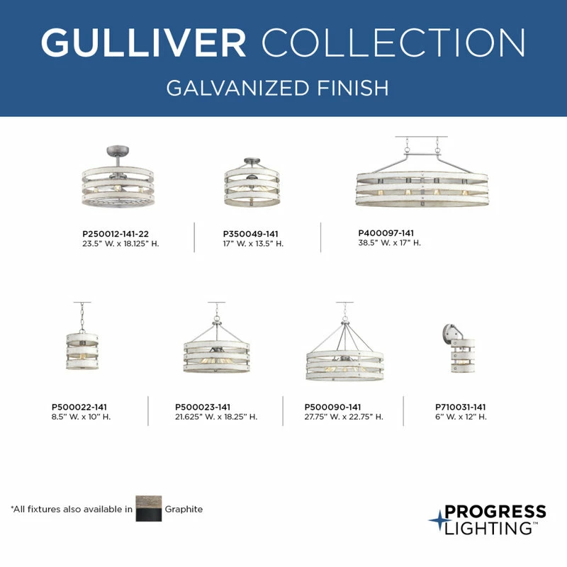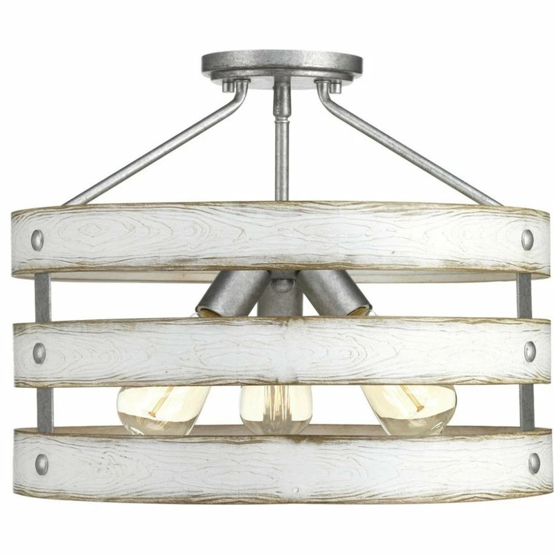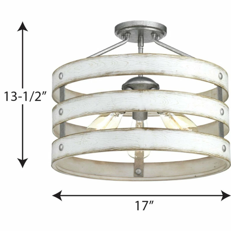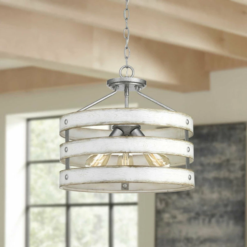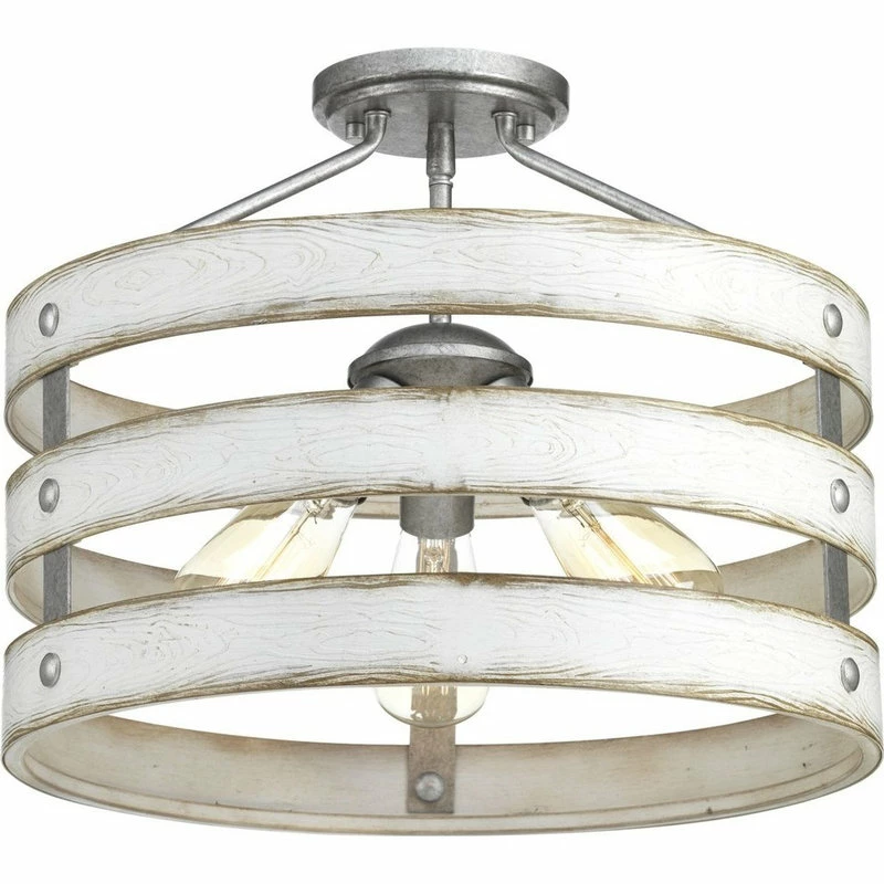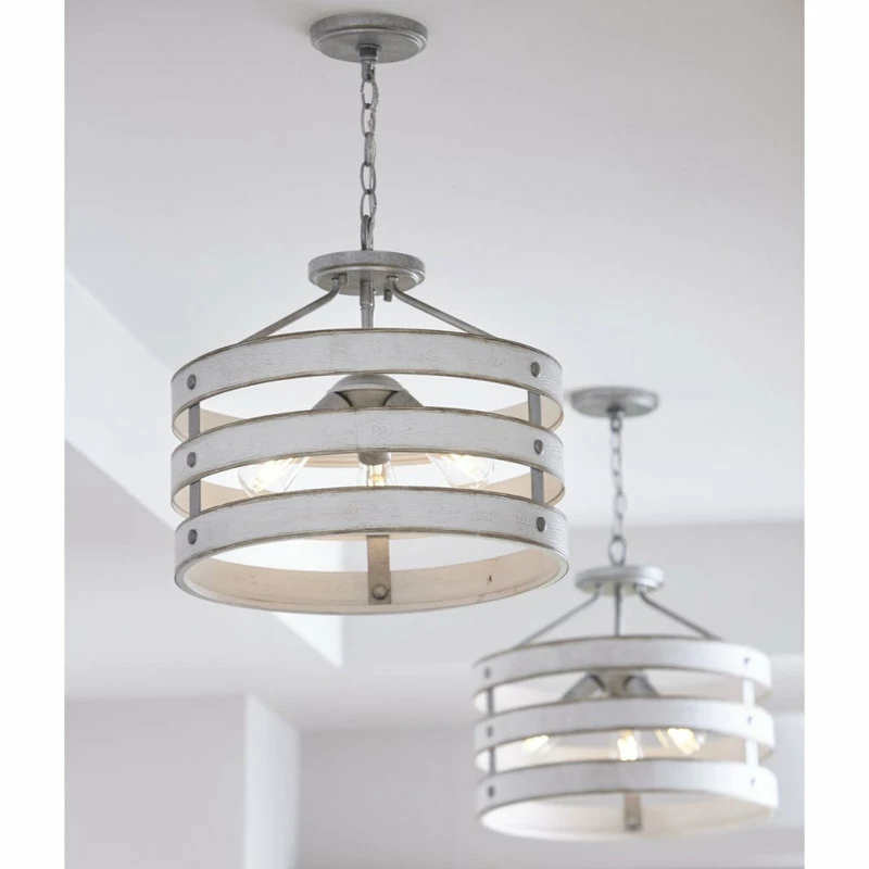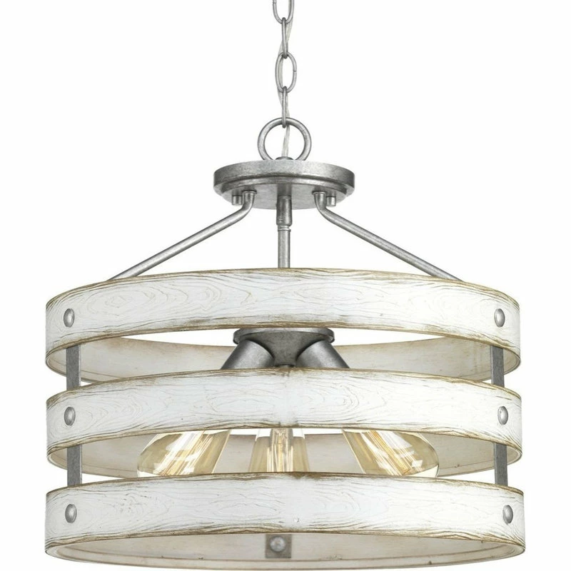Three circular bands wrap together to create an open design for Gulliver. Dual toned frame color combinations of Galvanized with antique white accents. A hand painted wood grained texture complements Rustic and Modern Farmhouse home decor, as well as Urban Industrial and Coastal interior settings. Uses (3) 75-watt medium bulbs (not included).