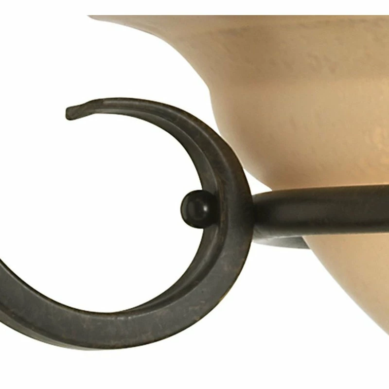 - Hand painted Forged Bronze finish with black and brown tones, Provided 3-light downlight in an oversized, bell-shaped glass bowl, Distinctive ebbing and flowing of flat steel arms and scroll accents, Tea-stained glass