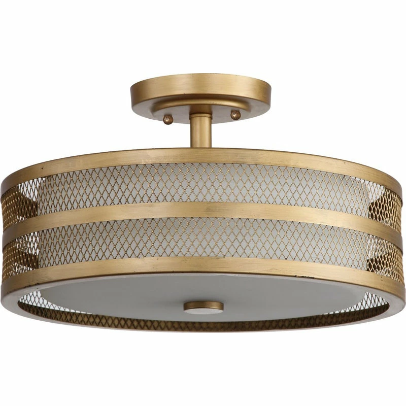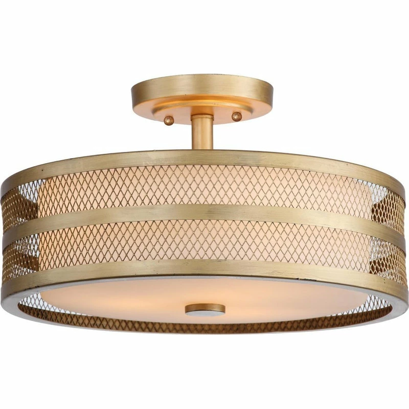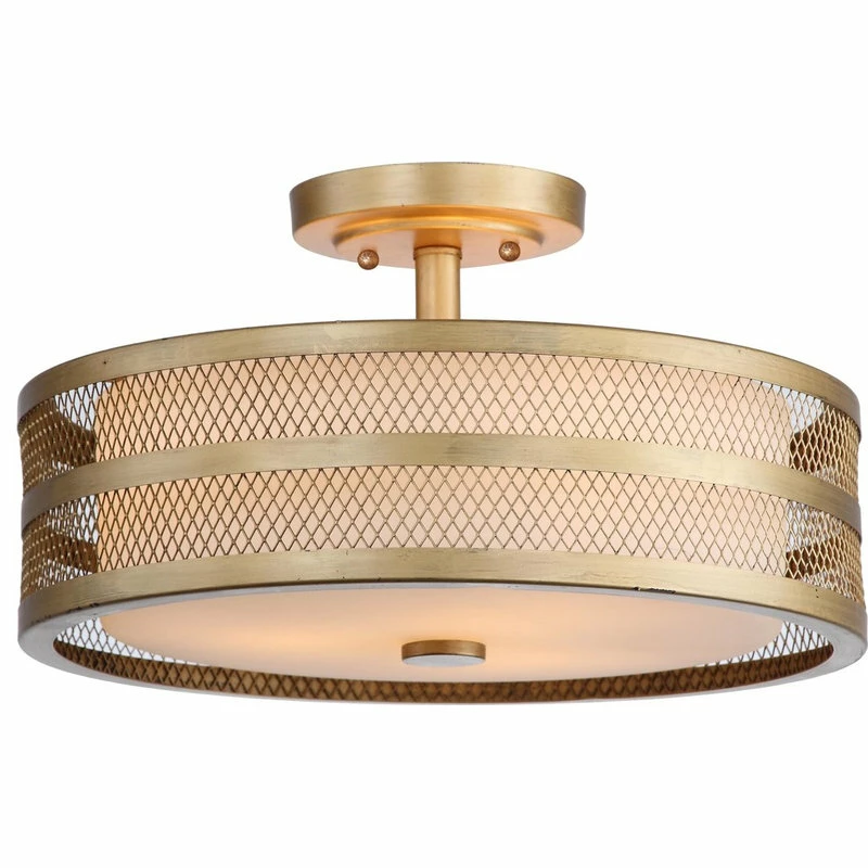 A modern double drum shade fixture, the Greta Veil ceiling light uniquely pairs a white etched glass inner shade with an outer shell of meshed steel in an antique gold finish. This elegant transitional light casts an elegant glow in any room it in habits.