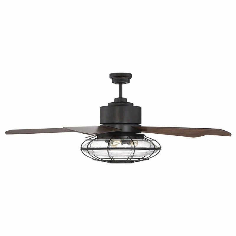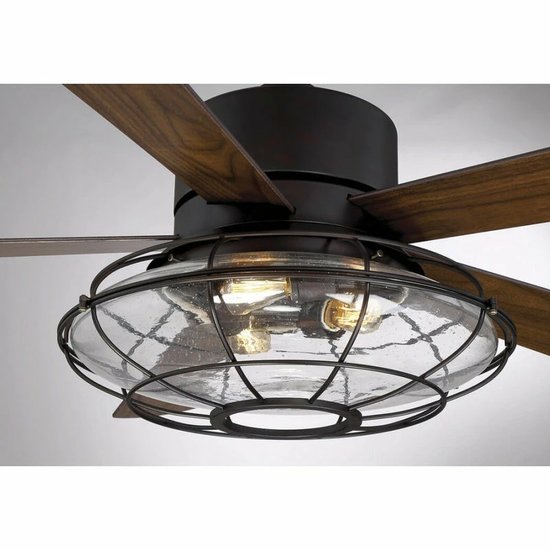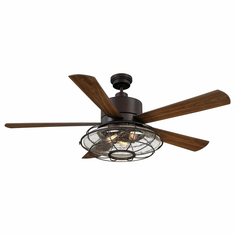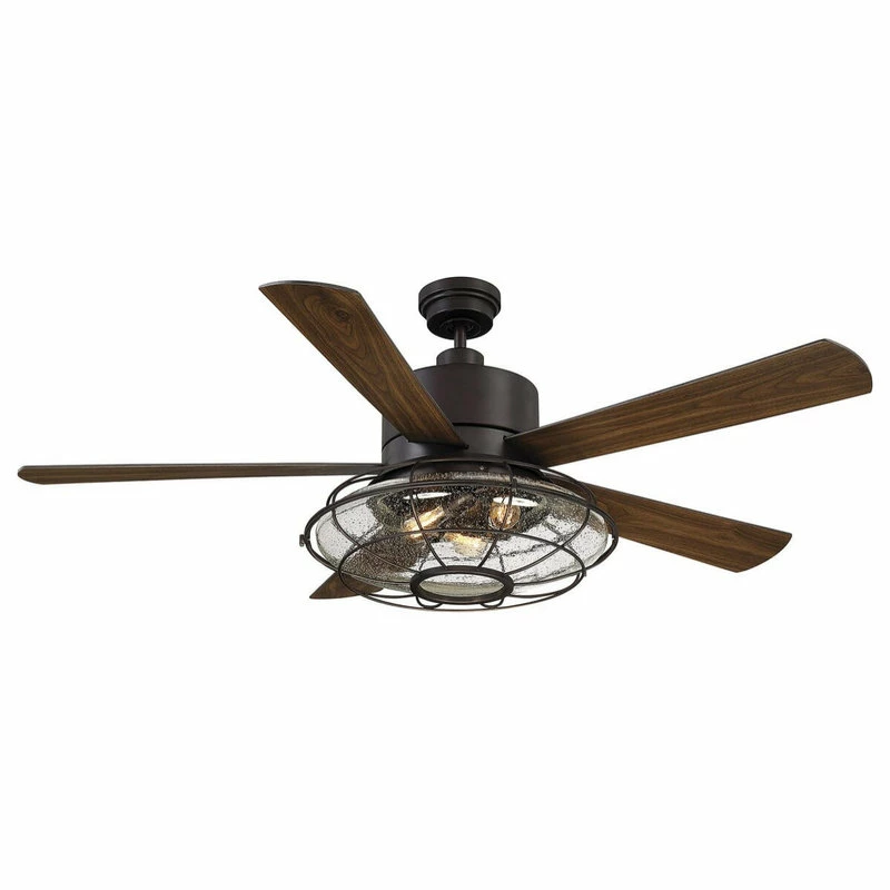 Look cool while you feel cool with the Connell 5-blade ceiling fan, artfully designed by Brian Thomas and manufactured with pride and precision by Savoy House. Like the many lights in the Connell family of products, this industrial style ceiling fan features a metal cage surrounding a clear seeded glass shade that houses three bulbs. Finished in deep English bronze for an authentic, aged look, it’s the perfect ceiling fan for rustic, transitional and industrial decors. Hang it in the family room, great room, bedroom or bath, and pair it with Connell sconces, bath bars, pendants or a trestle for a look that is cohesive yet cagey. Wherever you use it, you can enjoy the convenient handheld remote that makes controlling this fan a breeze. This light requires 3 , 8W Watt Bulbs (Not Included) UL Certified.