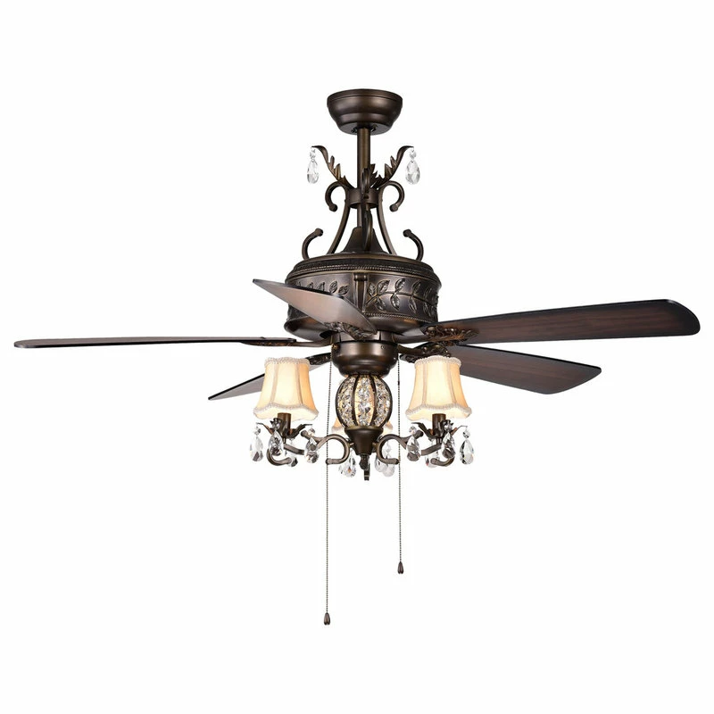 Perfect your traditional design scheme while making your room feel more comfortable with this antique-style ceiling fan and light combo. Three speeds in forward and reverse modes offer multiple fan options for all-year use, and the pitch and generous width of the five wood blades ensure effective air movement. Complete with crystal pendants and empire lamp shades, this three-light ceiling fan forms a decorative element in your room.
