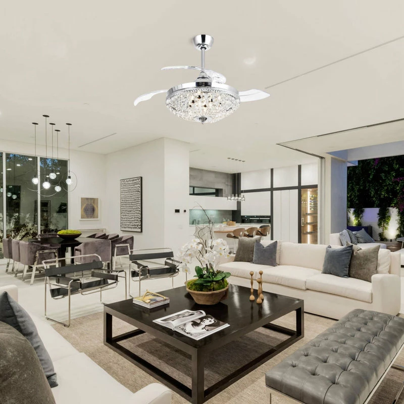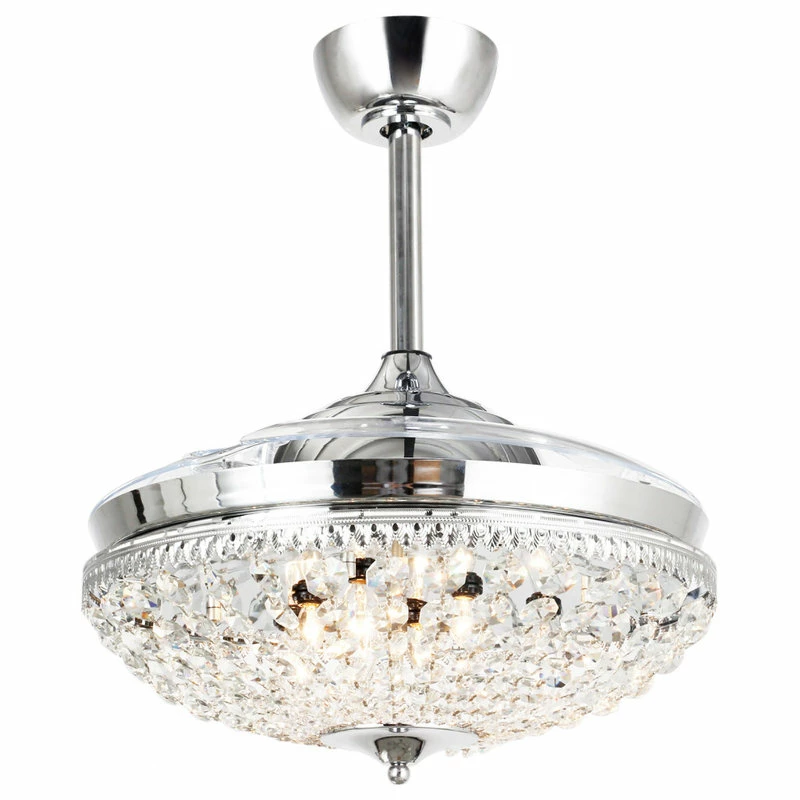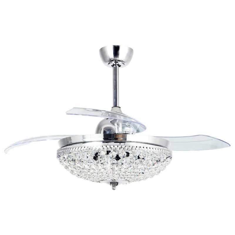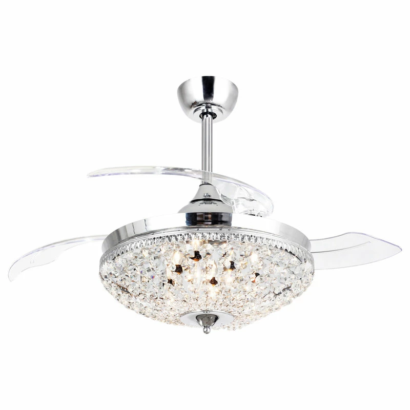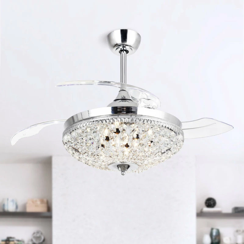 This decorative ceiling fan from whose lamp boasts a steel base with a sleek chrome finish. Defined by its opulent crystal glass embellishment, this product is designed with functionality in mind and has three-speed settings, complete with remote control. Combining artistic design and functionality with its integrated light, whose lamp Ceiling Fan produces white light, making a stunning accent piece for any interior space.